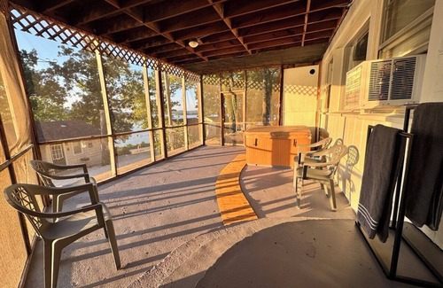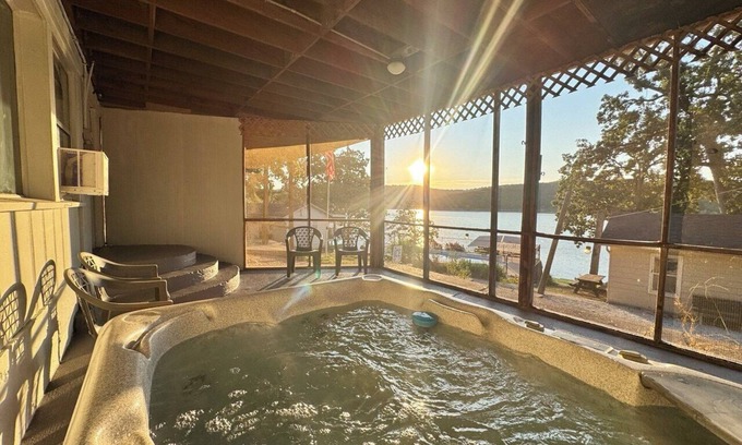 Relax in this cozy studio tucked away by the lake. Perfect for two, it features a private hot tub and a screened-in porch where you can sip your coffee or unwind in the evening breeze. Inside you'll find a comfy queen bed, a small kitchen setup for easy meals, and everything you need for a simple, stress free stay. Guests also have access to the resort pool, boat dock, and the beauty of Table Rock Lake just steps away. Note: