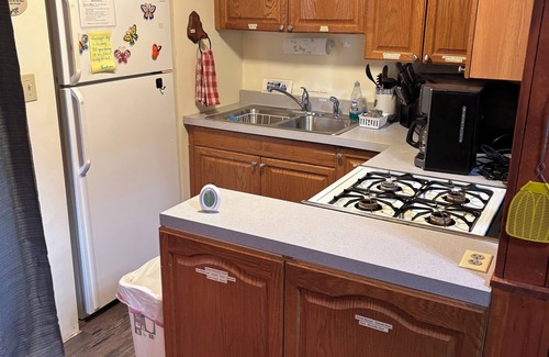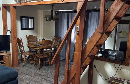 In this year-round cabin, you will find a full kitchen, bathroom, one private bedroom with a queen size bed, dining and living room with couch for additional sleeping, and a loft that has 2 single beds and an attic nook with additional space if needed.