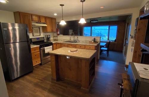 Cottage style cabin with a huge yard, perfect for the family and yard games. Great kitchen with island and beautiful lake view out the picture window. Cozy dining room with wood burning fireplace and large family table perfect for a family meal or game night. Enjoy the 3 season porch with windows all around and a large sliding glass door with a view of the lake. It is a great spot for reading a book, movie night, hanging out playing on the game table, or sleeping (super comfortable full size pull out couch). The spacious living room off the kitchen has vaulted ceiling, a ceiling fan, and connected TV making it a great spot for hanging out. The master bedroom is downstairs tucked off the living with a king size bed, ceiling fan, and great windows. Upstairs the bunk room with 4 beds (2 full, 2 twin) is perfect for kids and adults. Additional, private bedroom with barn door located off the loft area has a queen size bed. The is a loft with a queen size futon and is great for hanging out or sleeping. Great back porch off the living room provides seating to look out over the lake and a table for convenient outdoor dining. Near the lake shore there is a fire pit and a boat house with a table and chairs under a covered area that is a perfect hang out spot mid-day while playing by lake. Lake entry is sandy bottom and shallow. Washer and dryer.