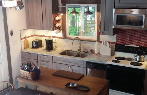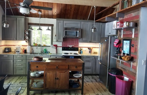 Open concept living/dining area w/cathedral ceiling overlooking the water with stunning sunrise views. Beautiful rustic style and modern design kitchen. Two bedrooms on first floor plus a loft with a broad view of the water. Updated rustic modern bathroom includes a bathtub. Nicely wooded lot with a gradual slope to shore. Sandy entry into water. Dock at shore. Short ride to Naples causeway and area activities. Good fishing, boating and swimming. Lovely large deck and a shore side fire pit. On site Parking for two cars. This is a peaceful spot. The water is one of the highest rated for quality in the state. Private dead-end road. It has both a charcoal and a gas grille.