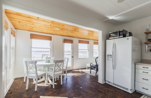 With comfortable furnishings throughout ranging from bedding to sofa, mattresses to dishware, you will be met with joy at every turn while at your lakeside retreat. Everything has been cultivated with thoughtful input in order to provide our guests the most inclusive lakeside beachy experience. From its charming tongue and groove ceiling to its beaded paneled walls, you'll feel right where you were meant to be. The lakeside deck is one of our favorite spots on the property as it offers inspiring south facing views of the lake. Capitalizing on our southern exposure, you are able to experience the best sunrise and sunset views. Waking up in your upstairs king size bed, you'll be able to lie there while enjoying unobstructed expansive views of the lake. There is also another balcony off the master bedroom giving you another perspective to enjoy. With a flat yard leading right up to the waters edge you'll be able to step right into the lake from your private water frontage. We also have a dock and boatlift available for use, so feel free to bring along the water toys!
