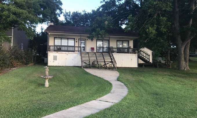 You will be on lake time from the minute you arrive and can enjoy gorgeous sunsets in the evenings. Located on the south end of Lake Livingston with lots of open water. The 3 bedroom house has 2-queen beds and one set of bunk beds with pull out trundle plus a twin blow up bed and one on the couch. There are 1 full bathroom plus a 1/2 bath. The open floor plan is great for entertaining with a beautiful view of the lake and magnificent sunsets. A large porch faces the water for extra entertaining with ceiling fans for a cool breeze. Kitchen table seats 6 and 2 barstools at the island plus a picnic table on the porch with extra chairs. There is central a/c and heat, washer & dryer. The kitchen is fully stocked with dishes and pots & pans. Bring food, drinks, paper goods, and sunscreen. The property has over a 100' bulkhead with an 8' sidewalk along the water's edge. Easy access to the water for swimming from the boathouse by a ladder. The ladder is at angle so it's easy to climb up or go down. For night fishing off boathouse there is an underwater light. There is a community boat ramp nearby or there is a public boat ramp about 3 miles away at Browder's.