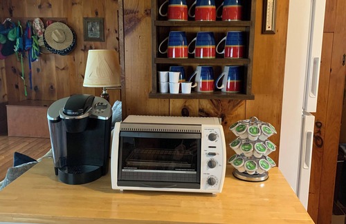 Directly across from the stove is our coffee bar! Equipped with a Keurig that has three cup size modes. K-cups provided (Breakfast blend and dark roast).