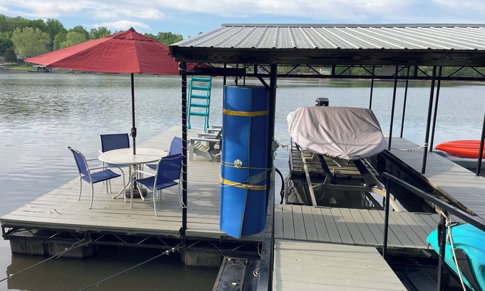 This beautiful lakefront home is located on the Westside, on the 4MM which is in the Mill Creek Cove at Lake of the Ozarks. Our home is located on the Gravois Arm and its the absolute best location on the lake. The house has a king bed in the master bedroom, a queen in the lower level bedroom and 2 full bathrooms. One on each level makes it great for 2 families to share this home. New furniture and cute updates on the inside makes this home cozy. Both sofas are sleeper's with premium comfy mattresses; no bars in your back with these! It also features a private swim dock, gas grill, 2 decks, 3rd is halfway down to the dock, Pedalboat, 3 Kayaks, fire pit, and so much more! A fully equipped kitchen! The swim platform on the dock is complete with a 4 person patio table and chairs, swim ladder, There is a jet ski ramp for you to use. This location has an incredible area for swimming. The cove is super calm and a no wake area perfect for using the kayaks and paddle boat; it's super fun! Lake Burger is at the beginning of the cove. Via boat these other restaurants about 10 minutes by water to Horny Toad & Shady Gators, Coconuts, and Jolly Rogers.