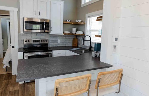 Step inside and be greeted by a thoughtfully designed space where every inch has been optimized for comfort and functionality. The sleek and chic interior features a stylish decor that exudes charm and character. Designed to sleep two, this tiny home features a king bed with luxury linens, a full bathroom with a walk-in shower and a double vanity. The well-equipped kitchenette beckons aspiring chefs to whip up delicious meals while the creature comforts such as high-speed Wi-Fi, washer and dryer, and designated parking for two vehicles, makes your home away from home a little...homier.