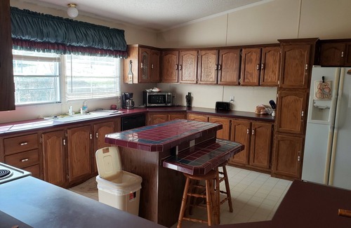 Inside, you'll find a spacious, open-concept layout with A/C, Wi-Fi, and a partially solar-powered energy system. The large, fully stocked kitchen includes modern conveniences like a waffle iron, air fryer, crockpot, and dishwasher—ideal for family meals after a day on the water. The master suite features a queen bed and a private bath with a shower and luxurious sunken Jacuzzi tub. Two additional bedrooms and a full bath offer flexible sleeping arrangements, including a full bed, two XL twins (convertible to a king), and a sleeper sofa in the living room.