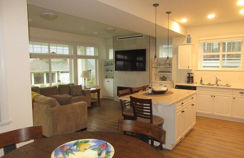 We have prepared the suite for both indoor and out door living. The kitchen, living room share a large island for entertaining and enjoying meals. A covered in patio area allows for the summer breezes to blow through the patio, but keeps you out of the direct sun. Or you can enjoy the sun on a small deck or on the grass in front of the suite. Our suite also offers easy access to the lake front beach and pool areas.