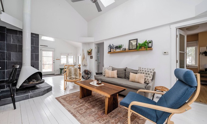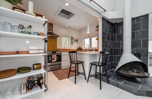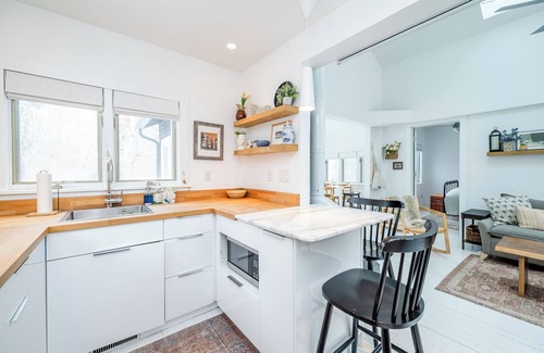 Interior of house is cute and cozy with lots of light throughout. Family room equipped with flat screen television. Warm up with the wood burning fireplace for those cool fall/winter evenings. Interior dining for four plus an adorable reading nook area. Fully stocked kitchen with island seating for two. Two bedrooms, one with a queen bed and one with a full.