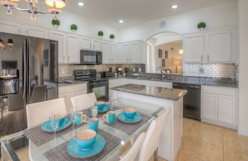 Our family room is grand, vast and spacious. All windows are tinted to deflect the Florida heat and compliments our fully air conditioned home. The room is superbly equipped with a 55 inch Smart TV with full cable package. The SONOS sound system will enable guests to personalize their music tastes whilst relaxing on one of our comfortable sofa s. This room also houses a dining table that caters for 5 diners with ease and is ideal for enjoying meals in a cooler environment whilst still offering great views over the lake and island.