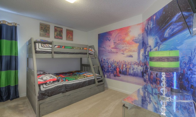 On the first floor there is a Star Wars themed bedroom with a twin over full bunk bed. The room has its own bathroom, wardrobe and 32" smart TV with full cable package.