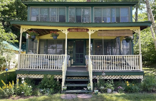 Peaceful rustic 1930s cottage on beautiful Lake Willoughby in the Northeast Kingdom of Vermont. Incredible sunset views over the lake from any of the 3 porches, open, screened and sleeping. Vintage wainscot walls hung with old and new artwork, and large front yard with a fire ring. Lovely cedar hedged alley leading to private beach across the road with deck, Adirondack chairs and a dock for sitting and swimming. Shallow swimming perfect for young children.