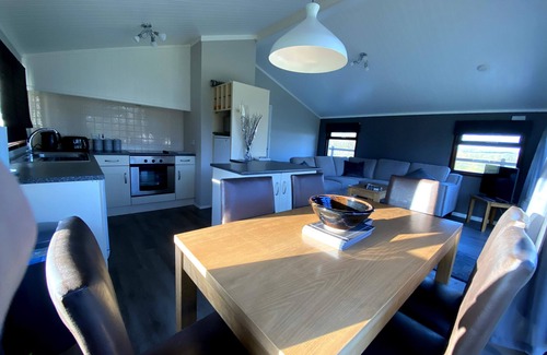 Modern design features in these new 2020 detached lodges. The property is accessed by a few steps , but once inside you are on one level. The good size open plan lounge, well equipped kitchen and dining space works very well to make use of the views. There are two double bedrooms, a twin bedroom and a single bedroom to sleep a total of 7 persons. Fabulous outside decked area on two sides.