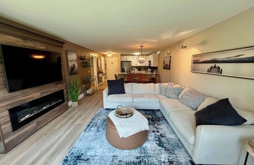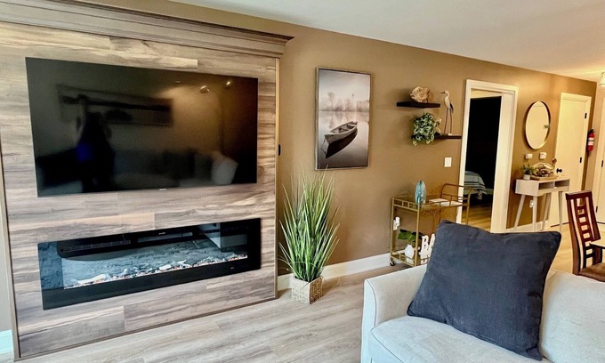 Inside, you'll find a tastefully updated space with modern finishes and cozy furnishings. The open-concept living area includes a comfortable sofa, smart TV with streaming capabilities, Wi-Fi, an electric fireplace, and access to a private balcony — the perfect spot to sip your morning coffee or unwind with a glass of wine at sunset.