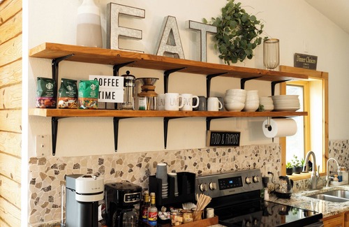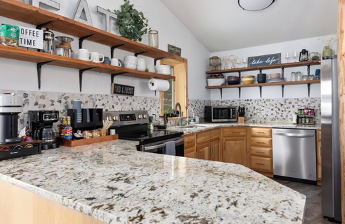The kitchen is fully equipped for your culinary adventures, featuring everything you need to prepare meals. Take advantage of the wood pellet grill and Blackstone griddle on the deck for al fresco dining. And don’t forget the Caffeination Station, complete with coffee, tea, decaf, a French press, and a milk frother—perfect for fueling your mornings.