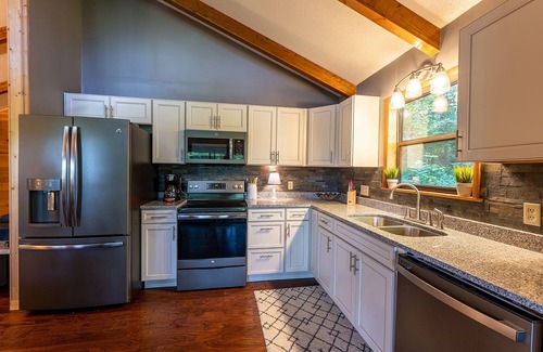 Your stay at the Lakeside Mountain Oasis offers a wealth of amenities designed for comfort and relaxation. The fully equipped kitchen makes catering easy, while the welcoming living area features a cozy wood-burning fireplace, perfect for romantic evenings. Step outside onto the expansive deck to soak in the stunning views from the outdoor hot tub or fire up the gas grill for a delightful barbecue. The main-level master bedroom boasts a king-size bed, while the lower level includes two additional bedrooms and a children's/game room nook—ideal for entertaining younger guests. For added convenience, a pack-and-play crib and baby gate are also provided.