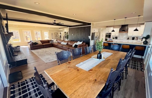 At Walcox Point, you'll find a beautiful 5-bedroom 4-bath home located at the epicenter of Waterhouse Cove at Weiss Lake. The house can comfortably accommodate up to 18 people and offers stunning views of the lake. The fully-renovated home features 850 feet of waterfront, making it an ideal choice for large family gatherings or groups of friends looking to relax.