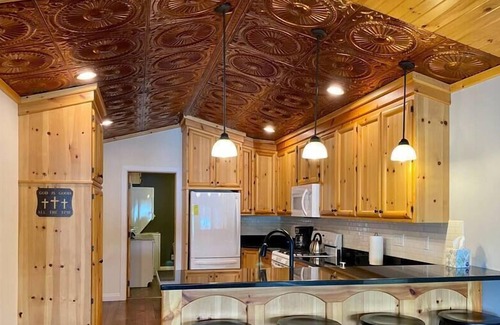 This 3 bedroom, 2 bath house has cozy vibes with pine trim and woodwork throughout. The kitchen has a beautiful copper ceiling and the spacious living room boasts a stunning view of the lake as well as a cozy fireplace! The garage space has been renovated recently to add the 2nd bath & 3rd Bedroom as well as additional living space, kitchenette & still to come- a game room area!