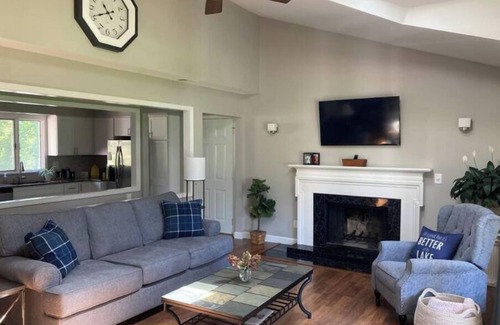 Stay on Lake Sara in Effingham with family and friends! Clean, comfortable home renovated in 2020 sleeps 8 adults with 2.5 baths and plenty of space. Several outdoor spaces including a large yard, patio, screened in porch, and a boat dock for swimming/relaxing lakeside. Fully stocked kitchen with new appliances and grill included. Comfy new beds, furniture and linens. Full finished basement. Located near several lakeside restaurants and only 15 min from Downtown Effingham! Dock is available to park your boat.