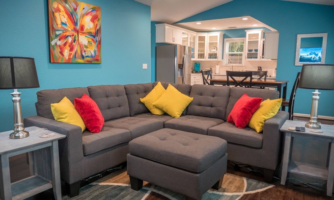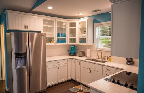 Villa features breathtaking indoor and outdoor views of peaceful lake! Guests also have use of private dock (lot's of nice Bass waiting to be caught), 2 kayaks, beach & swim area with additional lakefront shaded rocker chairs and an outdoor shower at the base of the Villa. Large private balcony overlooks lake and includes gas grill, 2 zero-g recliners and 2 outdoor sofas and table for relaxing with a glass of wine while viewing the gorgeous sunsets! Close to Bok Tower Gardens (5 min), Legoland (15 min), Disney (40 min). New construction was purpose built for vacation rental and is stylishly furnished with all new furnishings and is located on Oak lined quiet residential street and adjacent to 2 mile paved walking/biking path encircling the the lake. Plenty of large windows on all sides bring in beautiful natural light during the day, while large slat blinds and LED dimmable built in lighting create plenty privacy and warm light during the evening. Each bedroom includes a queen bed with soft headboard, ceiling fan, USB ports built into the nightstands for charging, large wall mounted 4K Smart TV, black out curtains, and a walk in closet with plenty of shelving for smart storage. The two full baths include tile floors, quartz counters, fully tiled glass enclosed showers, soap, shampoo, conditioner, towels, hair dryer, and all basic emergency amenities in case you forgot anything. Full kitchen includes all amenities such as Keurig Coffee Maker (we include the k-cups), teapot (and tea), toaster, beautiful built in lighting, all quartz countertops, glass windowed soft-close premium cabinetry, microwave, convection oven, premium cookware, basic spices and full size refrigerator with ice and water through the door. Laundry room contains full size washer and dryer as well as ironing board, detergents, and fabric softener. Large living area includes high top dining table for four, bamboo hardwood floors, large wall mounted 4K smart TV with premium sound bar, comfortable L-Shaped sofa with plenty of throw pillows and extra blankets, stylish decorations, Amazon Echo Music speaker, and 2 ceilings fans adjusted via remote control. Quiet central ducted air and heat with digital thermostat. Villa has two private entrances with electronic code locks for easy self check-in. Guests have private driveway parking for one vehicle. Hosts live in detached house next door and are available 24X7. Lake has a FREE public boat launch, so feel free to bring your own boat or jetskis and tie them up at the dock during your stay. Major shopping is a 3 minute drive away, everything you could possibly need (Walmart, Publix, Winn Dixie, Rural King) WEEKLY and MONTHLY DISCOUNTS
