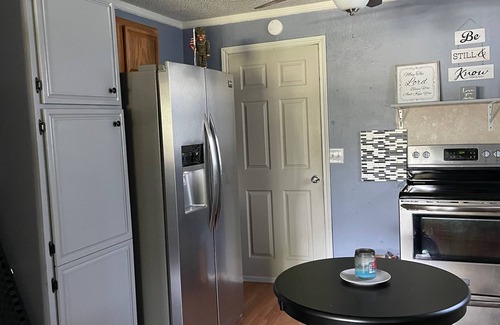 Owners manage 7 lake houses here, where we also live. Great lakeview/lakefront home for those that need temporary housing, short getaway, or a cheaper long term rate. The lake is across the street for easy access. In the Winter there are amazing sunsets from the porch. It is 2 bedroom and 1 bath house. The inside of the house is painted and decorated to give a calm relaxing feel. Bedrooms have queen beds. Full sized washer and dryer, wifi, and satellite TV. Pets are allowed. There is a small fenced area for pets, with a doggie door. Pets must be approved ahead of time. There is a $100 per pet fee.