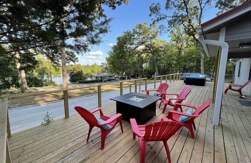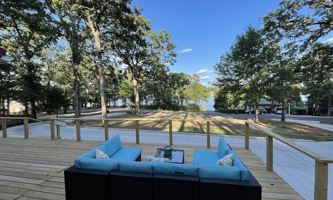 This newly remodeled 4 bedroom, 2 bath lake view cottage sleeps 11. The cottage has an outdoor living area on the expansive front deck overlooking the lake with multiple seating areas, a propane fire pit, and a grill. It also has a private dock on the lake that is accessible via a short footpath from the public boat ramp directly across the street. The cottage has a living room with a large, comfy sectional couch, a 65” smart TV with a Bluetooth sound bar that you can use to login to your streaming services and connect your devices, various card and board games, and countertop tables with stools for additional dining and game play space. The kitchen is fully stocked for all your cooking, baking and eating needs. The master bedroom has a king bed and full en-suite bathroom. There is also a queen bedroom, a bunk room with a twin over full bunk bed and a queen bed, a fourth bedroom with a twin daybed and twin trundle, and a 2nd full bathroom. Two beach chairs, two SUPs, and beach towels are provided, along with corn hole, washers, and badminton for outdoor fun. The cottage has a full circle driveway and parking pad for private parking, and there is a gravel lot across the street that can be used for overflow or boat parking, if necessary.