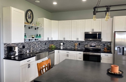 If being super close to Lake McConaughy is important for your family vacation, then look no farther. Get the feel of being on the lake from your front door at this 10 acre 3 bedroom home that includes a 50 amp hookup for your camper! Martin Bay, Lakefront Express, Box Car are minutes away and waiting for you. Built in 2022 this one of a kind property won’t disappoint whether you want to go jeeping on the beach, get your toes in the sand or put the boat on the water and enjoy Lake McConaughy! Imagine packing your sunscreen, toys, cooler and snacks and in less than a 10 minute drive having your boat in the water. You will absolutely love the open concept kitchen, huge bar and plenty of space for entertaining. The kitchen is fully stocked with dishes, stemware pots and pans and everything you need to cook up a storm. The HUGE covered porch is perfect for entertaining and enjoying the lake with the most beautiful sunsets! This Lakeview home has 2 king beds and 1 queen bed. Master bedroom is huge and could potential fit a queen bed as well as a large walk in closet where a crib or pack and play fits nicely. The family room also has reclining couches and room for blow up bed. Enjoy the large covered porch view of the lake with corn hole and BBQ on the electric grill, charcoal grill or Blackstone with beautiful sunsets.