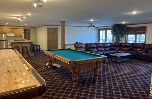 The house has a full basement of gaming fun for all ages to enjoy (pool table, air hockey, and shuffleboard). Comfortably sleeps up to 26 guests, with KING beds in 7 of 8 bedrooms. Just across the driveway is our shared swimming pool, arcade area, and a tennis court. When you get off the lake, relax in the Hot Tub overlooking the lake.