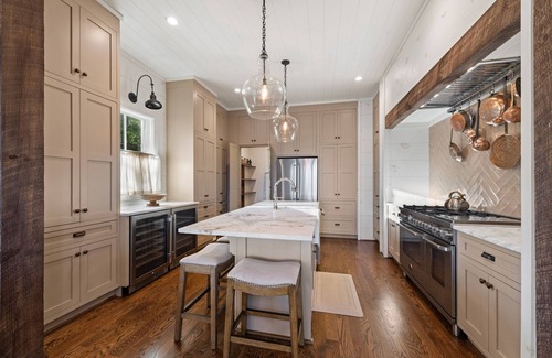 Kitchen – fully equipped main level kitchen, stainless steel appliances, double oven, gas stove, custom cabinets, granite countertops, butler's pantry, beverage cooler, breakfast bar seats 5, kitchen utensils, microwave, crockpot, blender, toaster, drip coffee maker (bring basket filters), Keurig