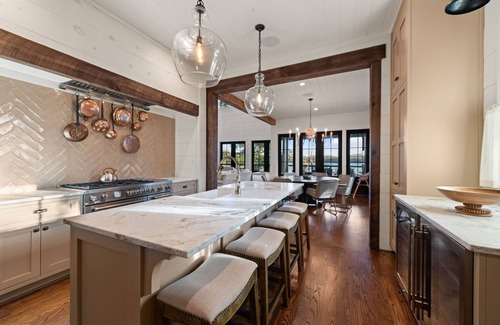Inside, the home is just as impressive. Expansive living spaces make it easy for everyone to come together, whether it's sharing meals around the table, lounging by the fireplace, or gathering for game nights. Floor-to-ceiling windows keep the sparkling lake in view, while multiple decks and outdoor living areas extend the fun into the fresh mountain air.