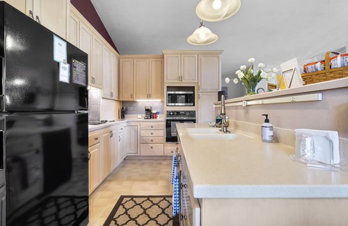 The kitchen has all the cookware, dishware and table ware you will need while you enjoy your stay at Lakeview Living. Just bring your food! You have a full-size fridge, electric stovetop, wall oven, dishwasher and microwave, as well as small appliances. There is a coffee maker and some supplied coffee and creamer as well! You have a dining room that can sit up to 14 with 2 tables. There is lots of stemware for you to enjoy located in the China cabinet.