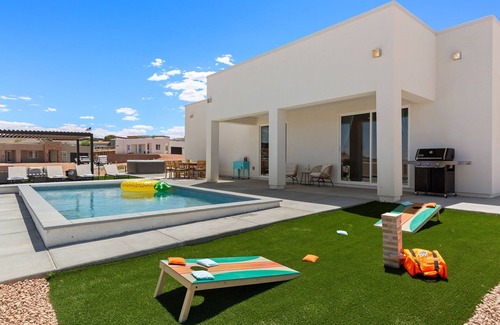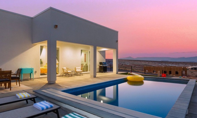 Adventure awaits at Lakeview Oasis at Powell! This new, family-friendly home is perfectly located just outside town in a quiet neighborhood. Enjoy a private heated pool, hot tub (coming soon), game room, fire pit, grill, lawn games, and stunning lake views. Stargaze under desert skies and dine outdoors. With ample boat/toy parking and only 13 mins to Wahweap Marina and 9 mins to Lone Rock Beach, it’s the ideal base for boating, hiking, and off-road fun at Lake Powell!