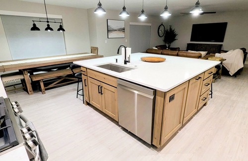 Spread over three levels, our vacation home comfortably accommodates up to 30 guests. The main level features an open-concept living, dining, and kitchen area, perfect for gatherings and family gatherings. The fully equipped kitchen boasts modern appliances (microwave, gas cooktop, oven, dishwasher, refrigerator/freezer), granite countertops, and oversized island bar.