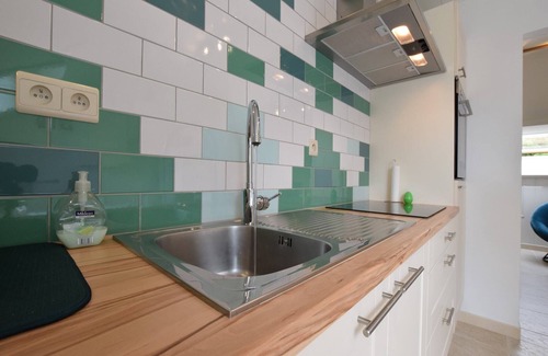 The apartment includes underfloor heating, so you can walk barefoot in comfort. For little ones, a children's bed and high chair are provided. Enjoy your morning coffee in the shared furnished garden, surrounded by greenery and calm.