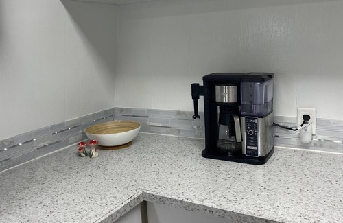There is a full kitchen and two full baths. The master bedroom upstairs has a queen bed & is attached to the master bathroom. The smaller bedroom downstairs also has a queen bed. The family room upstairs has 2 full-size futons.