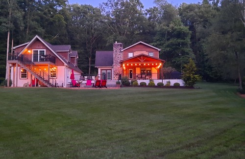This is the perfect property for the family looking to spend time enjoying nature, bird watching, or just simply relaxing. You might even spot some deer! Try your luck fishing for bass and bluegill in the pond, or grab a good book and sit in the gazebo by the pond. A large flagstone patio with lounge chairs, patio set with umbrella and gas grill is complimented by a large backyard overlooking the pond. This property is pet friendly, so you may bring pets along to enjoy, just check the pets box on your reservation. Ample parking is available in the curved driveway and the two car garage.