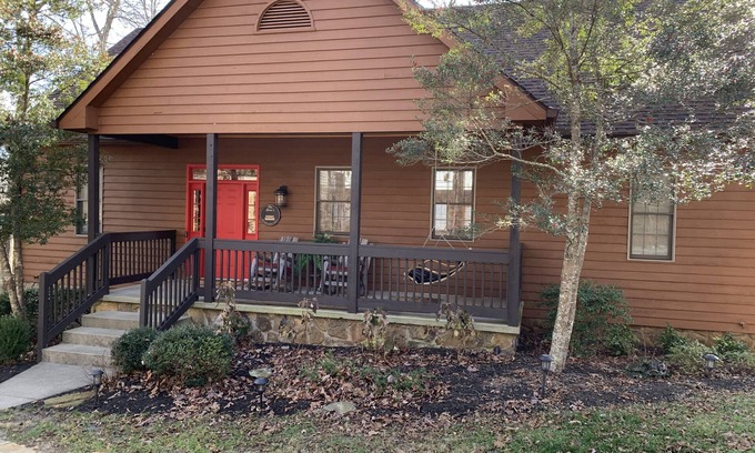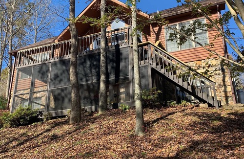 Welcome to our privately owned Lake House! Each of the four bedrooms has a King size bed and a master bathroom (shower/tub double sink and toilet) attached for maximum comfort and privacy. A hide-a-bed couch sleeps two more. On the top deck, enjoy our gas grill and lounge furniture to sit or lay in the sun with glimpses of Lake Cumberland through the wooded lot. Enjoy your morning cup of coffee, read a book, or have a glass of wine under the covered front porch in a rocking chair or on the relaxing porch swing. Take the party downstairs where a large 65” television with streaming service and a Blue Ray/DVD player are available. A coinless arcade has 300 classic games to choose from. There is an indoor kid’s clubhouse for children to play. Open the back-patio door to a large screened in porch that features an easily accessible step down into 6 person hot tub.