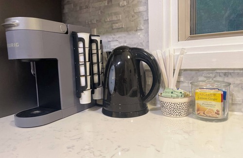 As you walk in, you’ll step into the beautiful fully equipped kitchen with quartz countertops and peninsula with bar seating. For your convenience we've provided coffee pods, a variety of herbal teas, and essential cooking items like oil and spices.