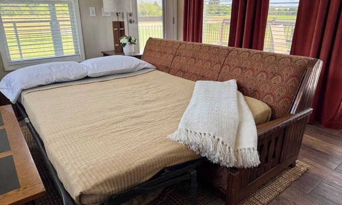 A private tiny home with a queen bed, full-size kitchen, and back-porch overlooking the pond. We're a half mile off State Highway 6 down a county-maintained gravel road. Hosts occasionally work on-site to care of cattle and maintain a small 4-space RV park at the other end of the property. Expect wildlife including the occasional spider, scorpion, or possibly a snake.