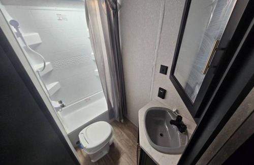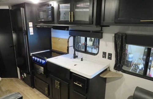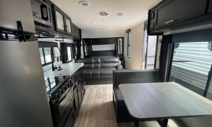 Queen Bed Memory Foam with double wide bunk beds. Table folds down to a bed and so does the couch. Sleeps 6 comfortably. 2 adults on queen bed, adults or kids on bunks, adults or kids on fold down. Will have running water. There is also a shower house located on site. There is room for 2 vehicles to park. Additional vehicles are additionally charged.