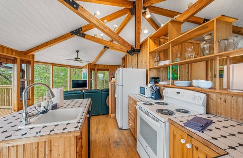 The open kitchen provides everything you need including new refrigerator, stove and microwave. L’Amour Rock also has a dishwasher and Keurig coffee maker. Open living room offers aww inspiring views from the roomy sectional plus a flat screen smart TV with WiFI for your favorite streaming. The bedroom features a King bed with cozy linens and woodland views that’ll have you wanting to sleep-in just a little longer! L’Amour Rock also offers a dedicated office space that is perfect for work stays or a writers retreat. The huge cozy chair in the office is perfect for curling up with a good book or for an afternoon nap. We also have an easel if you’re inspired to paint during your stay!