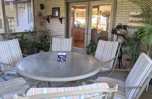 A Welcoming warm,cozy space that feels like "Home". Loved & Cared for,in a safe,quiet,peaceful,rooted neighborhood. Earth tones,hardwood/tile,country chic,super clean,owned by an artist. Wake up to morning coffee on a screened patio to sounds of birds in a garden sanctuary & large fenced yard. Dine on a tropical patio paradise with wine & romance or star gaze in a hammock for two.Even rainy days are a treat as the sounds of mother nature on a metal roof soothe the spirit.Serenity!