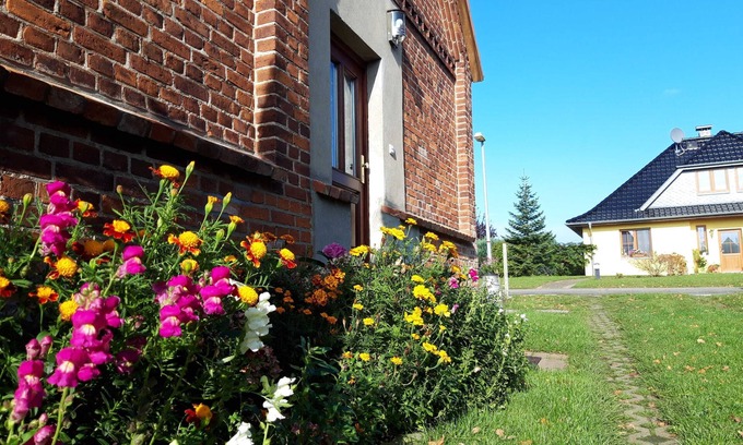 Holiday in a typical brick house built in 1900 on the Mecklenburg countryside - near Ostseebad Kühlungsborn and Rerik. Country house with apartment, renovation 2017, for 4 people with sun terrace, barbecue and fireplace. Magnificent garden of 4000m² in the yard of the host - to sunbathe, relax and play among fruit trees. Perfect for families with children and cyclists. In the middle of village nature only 8 km away from the lively Ostseestrand Kühlungsborn and Rerik. Apartment with private entrance, 2 bedrooms, shower room and kitchen - in the coastal beach between the Hanseatic city of Rostock and Wismar. Location and LocationGersdorf, small idyllic village south of the Baltic Sea resort Rerik (8km) and Kühlungsborn (12km) with wide white sandy beaches - naturist, pier, beach promenade, restaurants and cafes, cinema, swimming pool and sauna, water sports center, mini golf, steam train Molli. Shops and shops, post office, bank, gas station each 5km in the nearby Kröpelin. Horse farm, hay hotel and country cafe 2km. Golf 12km. Many beautiful bike paths along the field and forest also to the Baltic Sea start at the country house. Castle Gersdorf, playground, village pond and forest in the immediate vicinity. Attractions in the area Münster city Bad Doberan (12km), swimming pool, zoo and theater in Hanseatic city of Rostock (25km) and Wismar (30km). Country house with apartment 3-room apartment, for max. 4 persons, 60m², first time use 2017) with 20m² garden terrace, barbecue and fire pit.��On the garden plot (4.000m²) lives the host family in a separate country house part. Parking space and bicycle parking space directly at the house on the property. Children's extras: Large garden with space for romping. Village playground just 150 meters away. Baby cot and high chair available and free. On the paddocks in the village horses and cows graze with small calves. Deer and wild boars, as well as foxes and rabbits, are often seen on the nearby edge of the forest. Pets: not allowed, allergy-friendly Extra costs (fee) linen pack available on requestIncluding final cleaning. Additional costs such as electricity, water and heating included. Cot, highchair free of charge