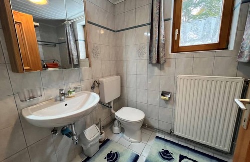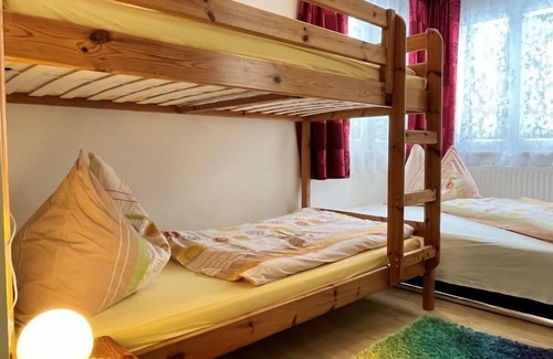"Landhaus Grüne Oase", 3-room house 70 m2 on 2 levels. Modern and stylish furnishings: living/dining room with Scandinavian wood stove, dining table, dining nook, satellite TV and radio. 1 room with 1 sofabed and 1 x 2 bunk beds. Kitchen (oven, dishwasher, 4 ceramic glass hob hotplates, kettle, microwave, electric coffee machine). Shower/WC. Upper floor: 1 room with sloping ceilings with 1 double bed. Wood heating. Terrace, patio. Terrace furniture, barbecue (portable), deck chairs (4), box-room. Very beautiful panoramic view of the mountains and the countryside. Facilities: children's high chair, baby cot. Internet (WiFi, free). Please note: non-smoking house. Maximum 1 pet/ dog allowed. Smoke alarm.