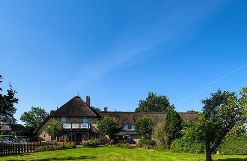 This exceptional holiday residence can accommodate up to 12 people on 370 m². You will find 2 living/common rooms, 6 bedrooms, 3 bathrooms with shower, bathtub and whirlpool, a large, modern kitchen with cooking island. The furnishings in the house are of very high quality and great emphasis was placed on chic designer furniture and home accessories. In the large living room, a tiled stove provides cozy warmth after a nice walk along the Eider. On the upper floor there is also a large gallery to retreat and relax.