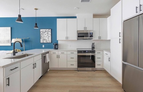 Discover your creative side at akin Golden Triangle, tucked into Denver’s vibrant art district near Speer Blvd, Cherry Creek Trail, and some of the city’s best museums and galleries. Perfect for flexible, monthly, or extended stays, our fully-furnished community blends downtown energy with upscale comfort. Your apartment features a full kitchen with quartz countertops, modern appliances, and a full-size washer/dryer.