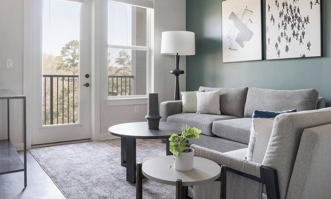 Step into comfort and style at Cadence Sugar Hill, your ideal stay for flexible, fully-furnished monthly or extended visits. Our spacious apartments feature full kitchens with stainless steel appliances, quartz countertops, and kitchen islands designed for cooking and entertaining. Enjoy nine-foot ceilings, wood-style flooring, and in-unit washer/dryers. Relax poolside at the resort-style pool, flow through yoga classes, or work from private office spaces.