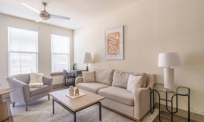 Enjoy a spacious, fully-furnished apartment just minutes from The Woodlands, perfect for monthly or extended stays. Each home features a full kitchen with stainless steel appliances, granite or quartz countertops, and an in-unit washer and dryer for everyday convenience. Start your morning at the Starbucks coffee bar, unwind by the resort-style pool, or stay active in the fitness center with Peloton bikes.