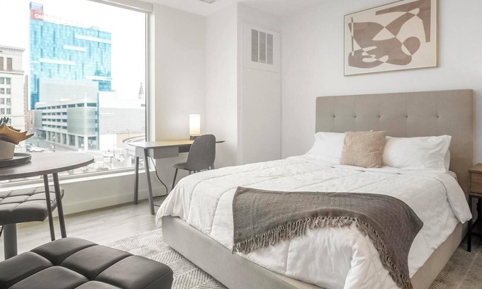 Stay in the heart of it all at eXchange! Steps from Detroit’s best sports, dining, and riverfront views, eXchange offers fully-furnished apartments perfect for flexible or monthly stays. Enjoy open-concept layouts, full kitchens with granite countertops, and floor-to-ceiling windows showcasing stunning downtown views. Unwind in the club lounge, stay active in the 24-hour fitness center, or connect with neighbors at resident events.