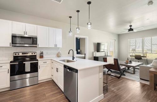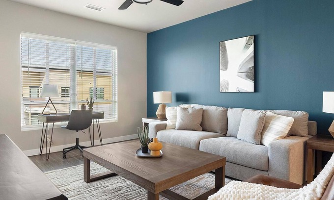 Welcome to Solace Ballpark Village in Goodyear, AZ! Just minutes from Goodyear Ballpark and surrounded by mountain views, scenic trails, and local dining spots, our fully-furnished apartments are ideal for monthly or extended stays. Inside your home, you'll find a full kitchen, stylish furnishings, and in-unit laundry. Step outside to relax by the resort-style pool, pamper your pup at the pet spa, or get work done in the business center.