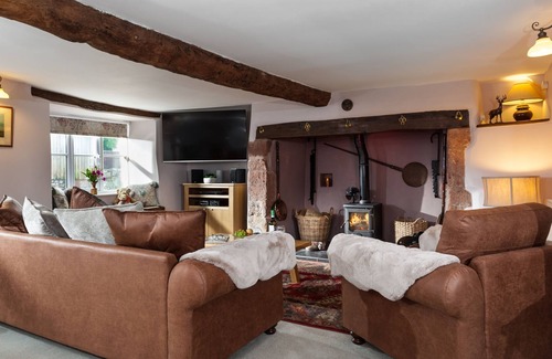 The lovely beamed living area with inglenook fireplace, log burner, comfy sofa and armchair is the ideal place to relax.